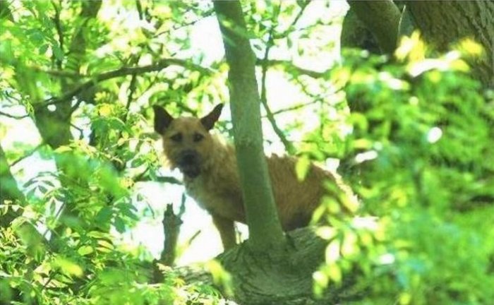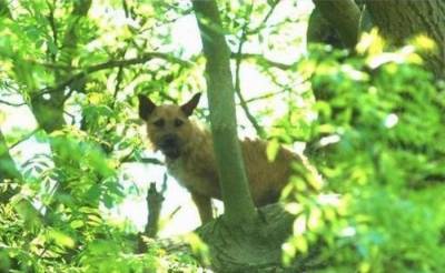 Люди очень удивились, когда обнаружили собаку так высоко на дереве, пришлось спасать.