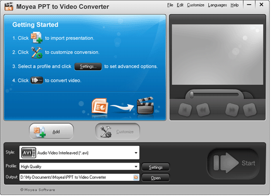 Moyea PowerPoint to Video Converter это профессиональный инструмент для конвертации файлов PowerPoint в видео. Всего 3 щелчка мышью - и ваши PowerPoint файлы будут сконвертированы в видео файлы разнообразных форматов: AVI, WMV, MPEG, MP4, MOV, FLV и 3GP. После конвертации вы сможете просматривать свои презентации как обычные видео ролики..
