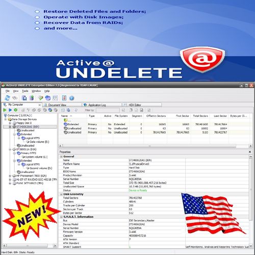Рабочий релиз UNDELETE 7 со всеми функциями Enterprise-версии и Boot CD Active@ UNDELETE - мощная программа, которая поможет вам восстановить потерянные файлы и разделы дисков. Программа также включает в себя утилиту для создания загрузочного диска, который содержит в себе утилиты для восстановления файлов и разделов и сможет запускаться без загрузки операционной системы в случае краха или повреждения вашей системы. Enterprise версия содержит в себе все функции профессиональной версии программы, плюс ко всему имеет функции для работы с RAID и сетью. Программа поддерживает более 50 типов файлов для восстановления, поддерживает все известные файловые системы (FAT, FAT32, NTFS, NTFS5 и NTFS + EFS) и HDD (IDE, ATA, SATA и SCSI).