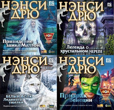 1. Нэнси Дрю. Белый волк Ледяного ущелья 2. Нэнси Дрю. Легенда о хрустальном черепе 3. Нэнси Дрю. Привидение замка Маллой 4. Нэнси Дрю. Призрак Венеции
