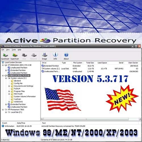 Active Partition Recovery - мощный инструмент для восстановления случайно удаленных разделов жестких дисков из Windows среды. Также с помощью данной утилиты можно делать резервную копию MBR таблиц разделов, загрузочных секторов жёсткого диска. Восстановление MBR происходит из резервных копий, и даже если структура таблиц разделов была повреждена вирусами или неосторожно удалена, вы сможете получить доступ к секторам жесткого диска, используя утилиту Disk Viewer. Программа поддерживает файловые системы FAT12, FAT16, FAT32, NTFS и NTFS5, а также интерфейсы IDE, ATA, SATA и SCSI. Кроме того, программа позволяет создавать образы дисков, корректировать файл BOOT.INI, поддерживает жесткие диски больших размеров, позволяет корректировать загрузочные сектора и многое другое.