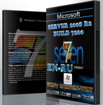 Так как 7260 x64 fre_client пока нет, и не предвидится, Vasill решил взятся за сервер, единственное что есть в наличии из 7260 х64. SERVER 2008 R2 BUILD 7260 одолжил у Взора, сделал нормальный загрузчик от 7260, встроил русский от server 7229, и поработал над интерфейсом, По умолчанию интерфейсом у сервера по сравнению с семеркой некрасивый, ни аэро ни гаджетов. Что получилось, сразу после установки включено аэро, и стоит тема Россия, установлен sidebar и интегрированы стандартные гаджеты. Все как в стандартных сборках от Vasill