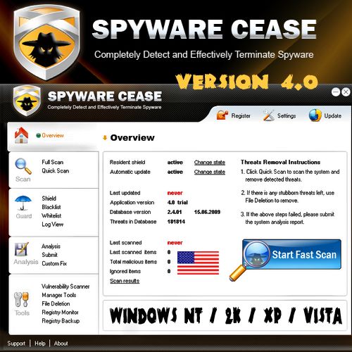 Spyware Cease - выдающаяся антишпионская программа для Windows, которая может быть использована для эффективной защиты вашего компьютера от различных вредоносных программ. Программа поможет вам защититься от троянских программ, шпионских и рекламных модулей, кейлоггеров, червей, руткитов, программ для кражи паролей и многих других вредоносных программ. Spyware Cease просканирует, удалит и заблокирует найденные вредоносные приложения. Утилита является мощным приложением для отлова и уничтожения вредоносных программ, но, при этом, программа не потребляет много системных ресурсов. С помощью этой программы вы не только сможете защитить свой компьютер от вирусов и троянских программ, но и с легкостью повысить производительность вашей системы.